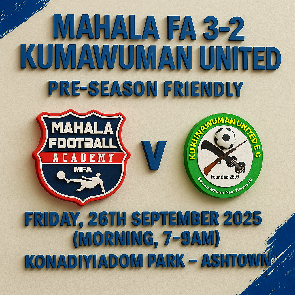 Mahala FA 3β2 Kumawuman United | Pre-season Friendly Date: Friday, 26th September 2025 (Morning, 7β9 am) Venue: Konadiyiadom Park β Ashtown Competition: Pre-season Friendly (Ahead of 2025/26 Season) Mahala Football Academy secured a thrilling 3β2 victory over Kumawuman United in an intense pre-season clash. The game was played at high tempo and gave fans a […]