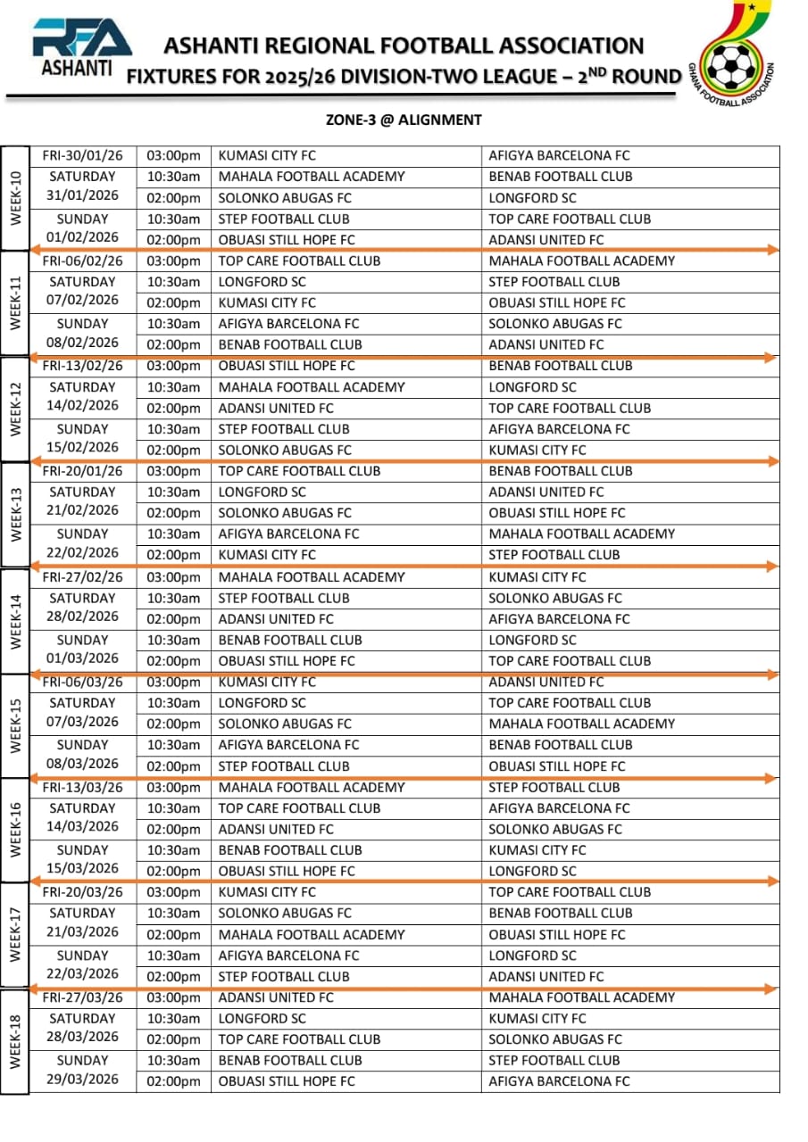 Division Two League: Second Round Continues with Mahala FA vs Benab FC The second round of the Ashanti Regional Football Association (ARFA) Division Two League continues this weekend as Mahala Football Academy take on Benab Football Club in an important Zone 3 encounter. The fixture is scheduled for Saturday, 31st January 2026, with kick-off at […]