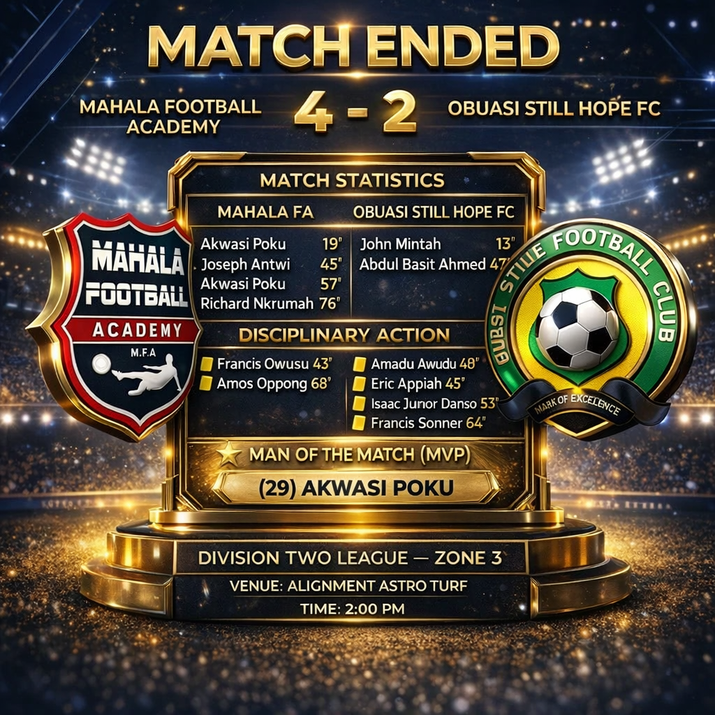 MATCH REPORT: Mahala FA Show Character in Six-Goal Thriller Comeback The Second Round of the league kicked off with fireworks at the Alignment Astro Turf this Saturday. Despite falling behind twice, Mahala Football Academy showcased elite tactical discipline and clinical counter-attacking football to secure a resounding 4-2 victory over Obuasi Still Hope FC. MAHALA FA […]