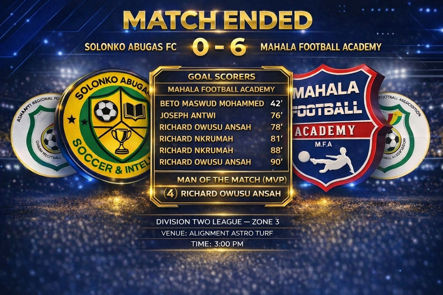 Mahala Football Academy Dominate Obuasi Still Hope FC Away Match Date: Sunday, 11th January 2026 Mahala Football Academy produced a commanding display on Sunday, 11th January 2026, cruising to an emphatic 5–1 away victory over Obuasi Still Hope FC in a match that kicked off at 2:00 PM. The performance highlighted the team’s attacking power, […]