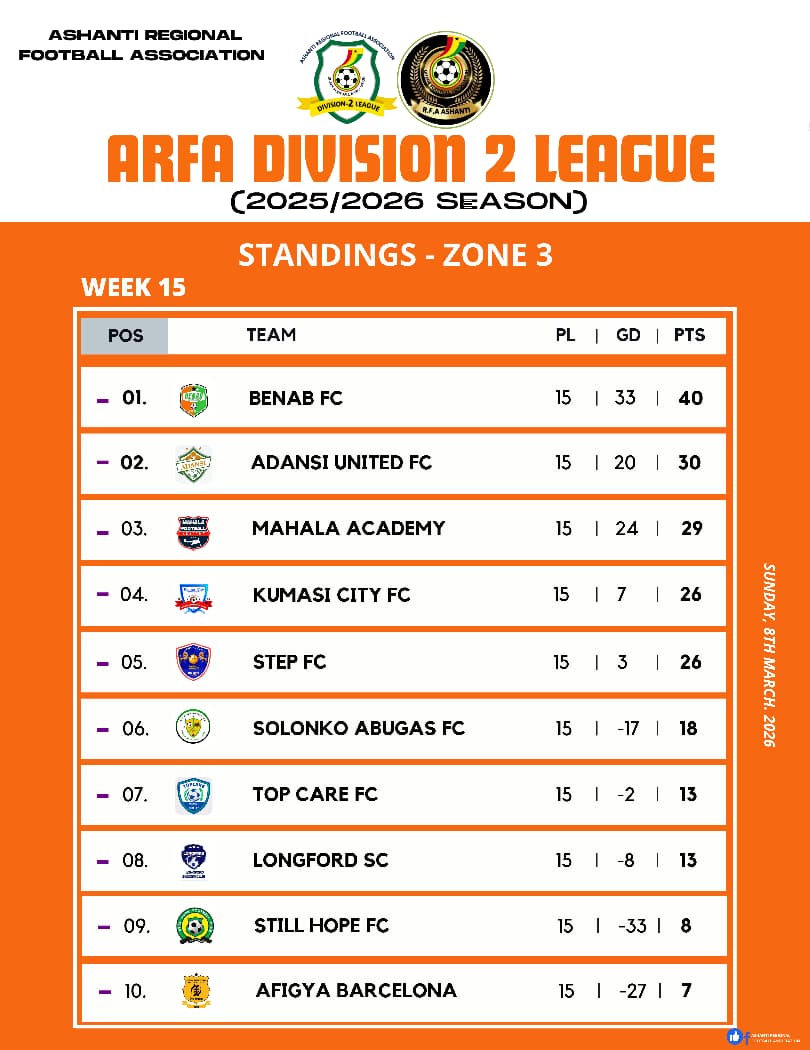 Division Two League: Second Round Continues with Mahala FA vs Benab FC The second round of the Ashanti Regional Football Association (ARFA) Division Two League continues this weekend as Mahala Football Academy take on Benab Football Club in an important Zone 3 encounter. The fixture is scheduled for Saturday, 31st January 2026, with kick-off at […]